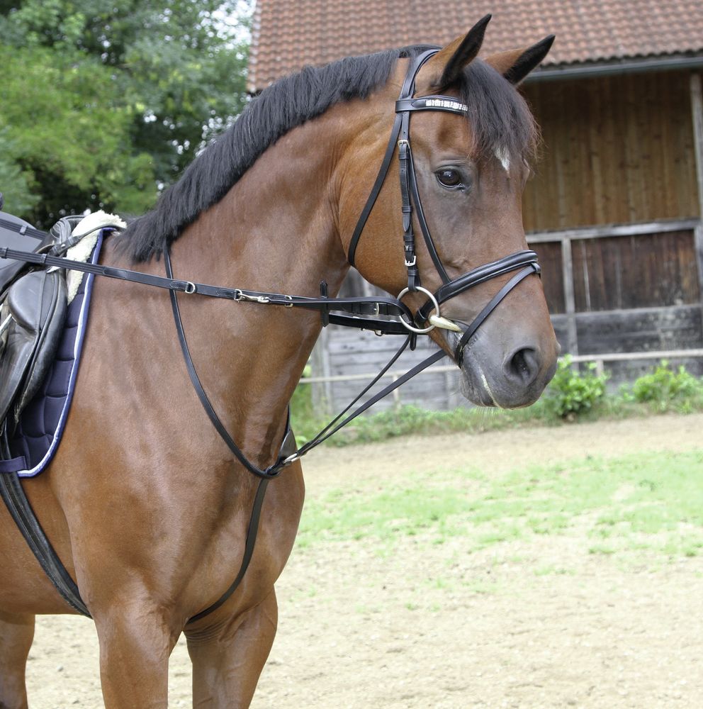 Повод Тодемана – это, по сути, смесь мартингала и скользящего повода, только в руках у всадника остается один повод, который фиксируется в трех положениях за счет перестегивания карабинов. Молодую лошадь очень легко «перетянуть» скользящим поводом (как следствие конь уходит за повод), поэтому использовать его нецелесообразно. Балансирующий повод оказывает более мягкое воздействие и при этом придает шее лошади округленное и приподнятое положение, мускулы лошади активизируются, а движения становятся более свободными. Тем не менее при работе с поводом Тодемана также важна мягкая рука. Балансирующий повод – это очень разумное, логичное и в то же время щадящее средство. В отличие от шпрунта, его можно давать в руки даже не слишком опытному всаднику. Материал: кожа и тесьмяный повод