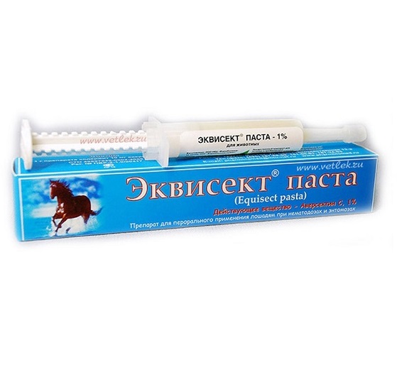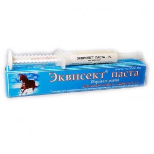 Эквисект паста – лекарственный препарат, представляющий собой однородную пастообразную массу светло-коричневого цвета со слабым специфическим запахом в шприце-дозаторе. Состав: В качестве действующего вещества содержит Аверсектин С 1%, а также вспомогательные компоненты. Фармакологические свойства: Аверсектин С, входящий в состав Эквисект пасты, является противопаразитарным средством контактного и системного действия, активен в отношении имагинальных и личиночных стадий фаз развития нематод, вшей, кровососок, личинок носоглоточных, желудочных оводов, паразитирующих у лошадей. Механизм действия – нарушает проведение нервных импульсов, что приводит к параличу и гибели паразитов. Порядок применения: Эквисект пасту назначают для лечения и профилактики стронгилидозов, трихонематидозов, оксиуроза, пробстмауриоза, параскаридоза, стронгилоидоза, трихостронгилеза, диктиокаулеза, парафиляриоза, сетариоза, онхоцеркоза, габронематоза, драйшиоза, а также гастрофилеза и ринэстроза лошадей. Препарат применяют с лечебной целью однократно перрорально из расчета 2 г на 100 кг живой массы лошади. Пасту выдавливают на корень языка из шприца-дозатора, который вводят в межзубное пространство ротовой полости и потом на несколько секунд приподнимают голову. Схема применения взрослым лошадям: - Параскаридоз, оксиуроз – в стойловый период 1 раз в 2 месяца - Гастрофилез, ринэстроз – по показаниям в пастбищный период 1 раз в 2 месяца -Стронгилоидоз, стронгилятоз – Не реже 1 раз в 2 месяца в пастбищный сезон -Трихостронгилез, диктиокаулез – В пастбищный период 2 раза весной и осенью - Онхоцеркоз, парафиляриоз, сетариоз – 1 раз в месяц в период лета насекомых - Габронематоз, драйшиоз – По показаниям весной, летом и осенью Схема применения подсосным жеребятам: - Параскаридоз – С 2-3-х месячного возраста 1 раз в месяц - Стронгилоидоз, стронгилятоз – С 2-х недельного возраста 1 раз в месяц -Трихонематидозы – С 3-х месячного возраста до отъема 1 раз в 2 месяца - Пробстмауриоз – По показаниям гельминтоскопии, однократно Форма выпуска и условия хранения: Выпускают расфасованным по 14 г в полимерных шприцах-дозаторах. Хранят в прохладном защищенном от света месте в заводской упаковке при температуре от 0С до +25С. Срок годности – 3 года. Примечание: Препарат малотоксичен для теплокровных животных
