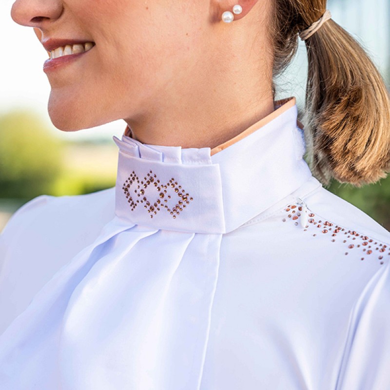 Элегантная манишка-галстук для выступлений из атласной ткани с оригинальным рисунком из мелких страз. Подойдет к любой блузе с воротничком-стойкой. Застежка на липучке. Деликатная стирка при 30 С.
