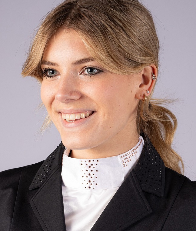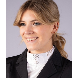 Изящная манишка-галстук для выступлений из атласной ткани, украшенная россыпью сверкающ страз. Подойдет к любой блузе с воротничком-стойкой. Застежка на липучке. Деликатная стирка при 30 С.