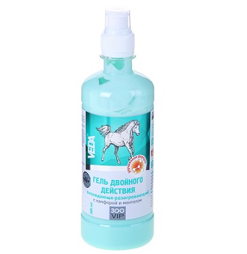 Производитель: Веда, Россия. В состав геля входят ментол, экстракт перца стручкового, экстракт прополиса, эфирное масло гвоздики, эфирное масло эвкалипта Показания к применению: Гель применяют в качестве средства для наружного гигиенически-оздоровительного ухода за кожей лошадей, для улучшения обменных процессов в мышцах, связках, суставах. Гель обладает уникальным двойным действием, обеспечивающим гармоничность процессов тонизирования и успокоения. Используют для подготовки мышц к нагрузкам и восстановления при переутомлении, сочетая с приемами массажа, укрывания и бинтования Первоначально развивается охлаждающее действие эфирного масла эвкалипта и ментола, которые быстро и глубоко проникают в ткани, моментально облегчая состояние лошади. Затем начинается разогревающее и расслабляющее воздействие камфоры и экстракта перца, которые снижают болезненные ощущения, стимулируют привлечение в место воспаления дополнительных факторов иммунной системы, ускоряя процессы восстановления и заживления травмированных тканей. Активизация микроциркуляции обеспечивает устранение застойных явлений и снижение риска развития воспалительных процессов, связанных с поверхностными травмами (без нарушения целостности тканей) — ушибами, гематомами, растяжениями, отеками. Гель наносят на предварительно очищенную поверхность кожи и втирают легкими массирующими движениями. Используют 2 – 3 раза в день. После нанесения средства рекомендуется возможный покой 20 – 30 минут. Гель можно не смывать. Сочетается с любыми лекарственными средствами. Гипоаллергенно. Не наносить на поврежденные участки кожи, избегать попадания на слизистые. Объем 500 мл