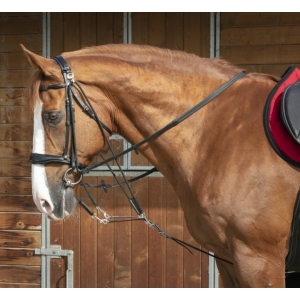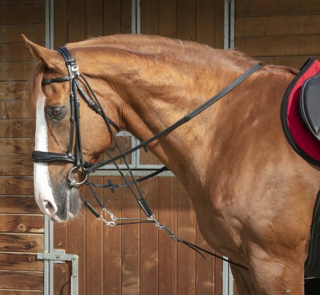 Гог напоминает шамбон, только крепится карабинами не к кольцам трензеля, а пропускается через них и пристегивается к кольцам на дополнительных ремнях крепящимся к подпруге. Получается своеобразный треугольник со сложной рычажной системой. Этот гог сделан из кожи высокого качества с крепкой фурнитурой из нержавеющей стали и прочными нейлоновыми веревочками. Размер: Full. Цвет: черный.