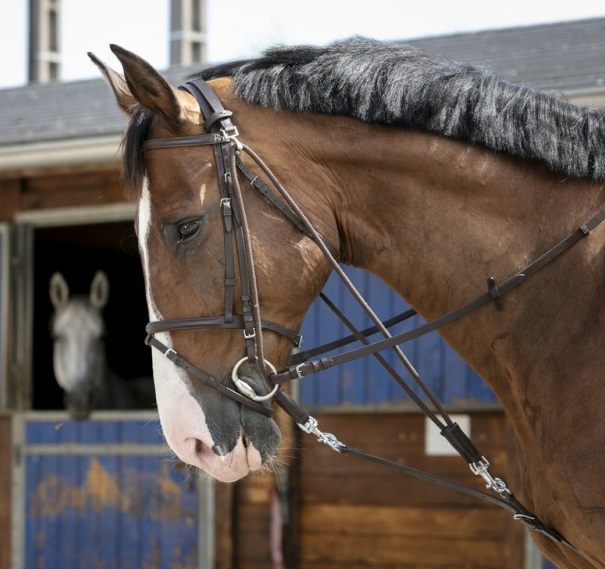 Вспомогательный повод для расслабления и укрепления мышц шеи и спины. Состоит из 1 кожаного затылочного ремня, 2 шнуров с 4 карабинами и 1 кожаного ремня. Кожаный ремень, крепящийся к подпруге, регулируется по длине. Материалы: кожа, нейлоновый шнур, фурнитура из нержавеющей стали.