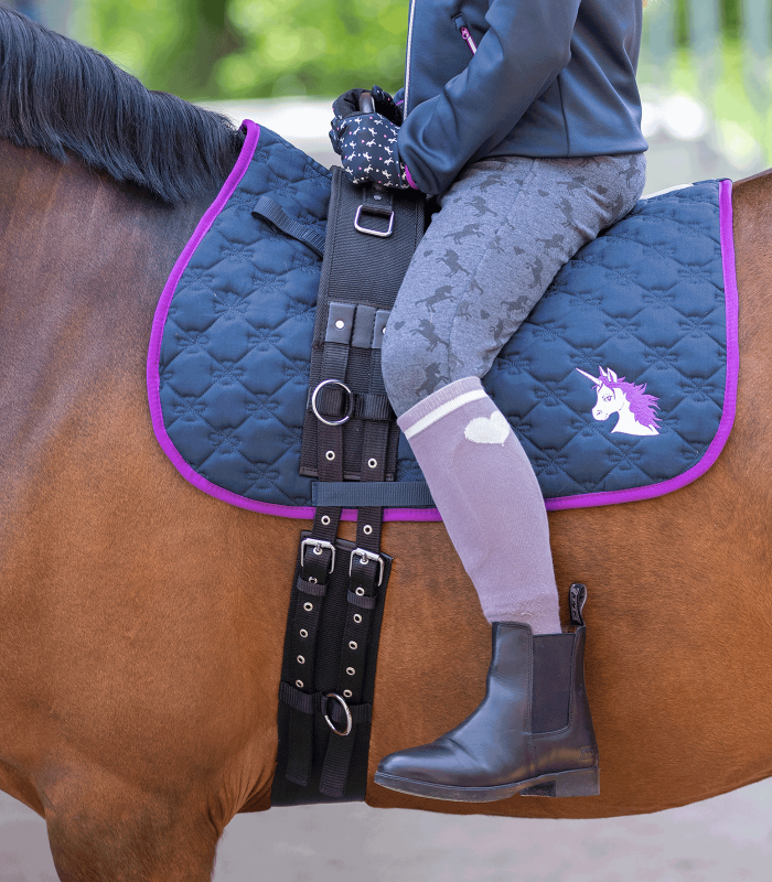Гурта из прочного синтетического материала с одной кожаной ручкой. Подойдет для иппотерапии или обучения. Подбрюшный ремень пристегивается с обеих сторон. Есть прямоугольные кольца к которым можно пристегнуть стремена и 4 кольца для крепления дополнительных средств управления. Регулируется по обхвату: Full - от 180 см до 240 см