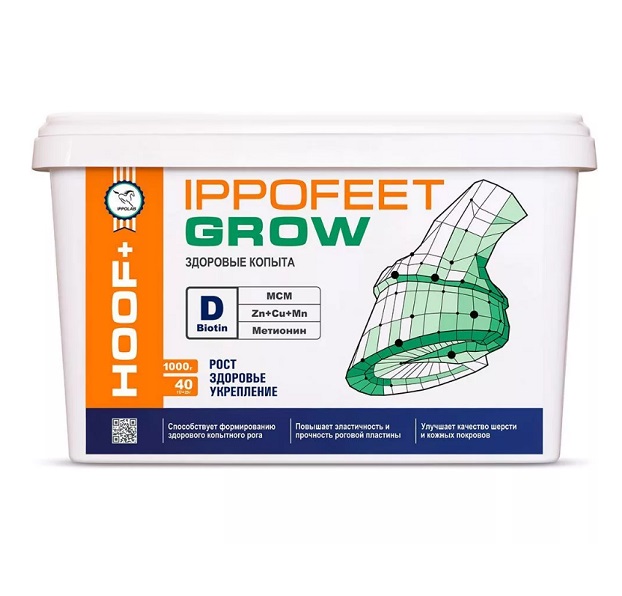 Комплексная подкормка для укрепления и поддержания роста здорового копытного рога , а также для улучшения состояния шерсти и кожи. IPPOFEET GROW компенсирует дефицит биотина и цинка и возникающий при несбалансированном рационе , что зачастую проявляется в медленном росте копытного рога, повышенной ломкости и мягкости, ухудшению качества шерсти и кожи. Ежедневное добавление IPPOFEET GROW в течение нескольких месяцев существенно улучшает и укрепляет копыта лошади. Содержит в 25 г (1 порция): Лен микронизированный-8 г, метионин-5 г, дрожжи Saccharomyces CEREVISIAE (1,67 х 10 в степени 12 КОЕ)-5 г, глицинат цинка-1,6 г, экстракт розмарина-1 г, экстракт цедры цитрусовых-1,марганец сульфат-0,5 г, глицинат меди-0,5 г, диоксид кремния-0,5 г, D-Biotin-50 мг, кальций карбонат-до 25 г. Дозировка Лошади весом до 500 кг- 25 г Лошади весом от 500 кг- 35 г Максимальная суточная дозировка - 50 г. 1 мерная ложка без верха= 25 г, с верхом=35 г