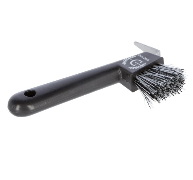Пластиковый крючок для копыт оснащен металлическим крючком и щеткой с жестким ворсом.