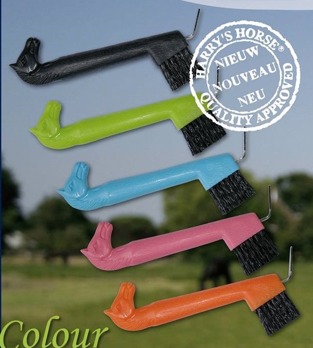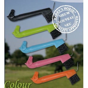 Пластиковый крючок для копыт в форме лошадки оснащен металлическим крючком и щеткой с жестким ворсом.