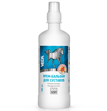 Производитель: Веда, Россия. Показания к применению: Предназначен для гигиенического ухода за суставами лошадей, для полноценного восстановления суставов при интенсивных нагрузках, сохранения и продления активной работоспособности, для оздоровительного ухода за проблемными суставами, для реабилитационного ухода при легких травмах и растяжениях, а также в качестве вспомогательного средства в комплексе процедур при или после интенсивной терапии суставов. Действие крема-бальзама обусловлено комплексом биологически активных веществ, оказывающих целенаправленное благотворное влияние на улучшение состояния суставных поверхностей и внутрисуставной жидкости. Оздоровительный эффект связан с активизацией микроциркуляции, устранением застойных явлений, восстановлением клеточных мембран, легким отвлекающее-обезболивающим воздействием, питанием и противовоспалительной защитой суставов и прилегающих тканей. Бальзам представляет собой многофазную микроэмульсию, что обеспечивает глубокое проникновение активных компонентов в ткани, мягкое действие и пролонгированный эффект. Гипоаллергенен. Состав: вода очищенная, эмульсионная основа, экстракт сбора лекарственных трав – цветки арники, трава донника, почки сосны, трава полыни обыкновенной, шишки хмеля, семена каштана, трава окопника, листья каланхоэ; глицерин, масло касторовое, масло оливковое, масло – воск жожоба, салициловая кислота, эфирное масло и смола пихты, витамин Е, аскорбилпальмитат, лецитин, консервант. Крем-бальзам предназначен как для регулярного, повседневного применения, так и курсового использования. Длительность курса не менее 2 – 3 недель. Применяют 1 – 2 раза в сутки из расчета 10 – 30 мл на один сустав, для повышения интенсивности ухода можно увеличивать кратность применения до 4 раз в сутки. Наносят легкими втирающими движениями до полного впитывания, при необходимости сочетают с массажными процедурами. Чередование курсов «Геля двойного действия» и «Крем-бальзама для суставов» или их совместное использование повышает эффективность процедур. При совместном использовании рекомендуется сочетать средства в режиме – гель двойного действия перед нагрузками, крем-бальзам после нагрузок или в период отдыха, перед сном. Крем-бальзам экономичен в использовании, быстро впитывается, не оставляя жирных следов и не пачкая шерсть, не требует применения повязок. Объем 500 мл.