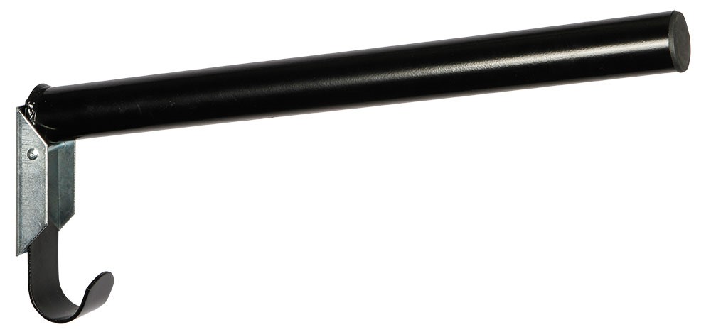 Кронштейн для седла, складывающийся вниз. Удобно использовать в проходе конюшни. Сделан из металла. Длина: 46 см. Цвет: черный
