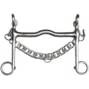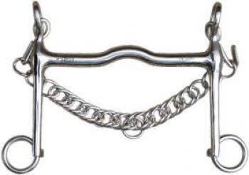 Мундштук с тонким грызлом оказывает более сильное воздействие.на рот лошади. Также его можно применить к лошадям с низким небом, у которых малое пространство во рту. Мундштук сделан из высококачественной нержавеющей стали и оснащен цепочкой и крючками. Длина рычага 125 мм. Толщина грызла 12 мм.