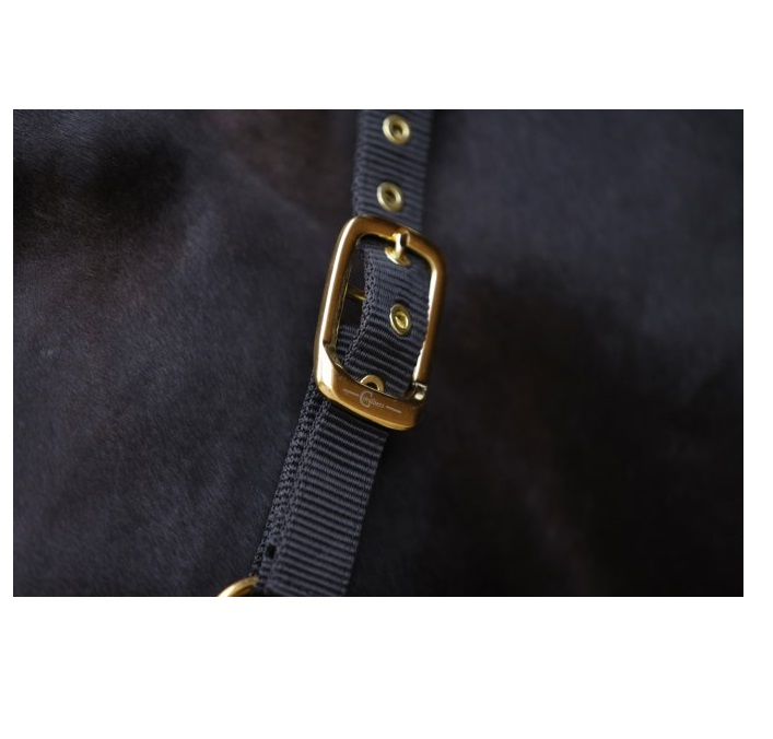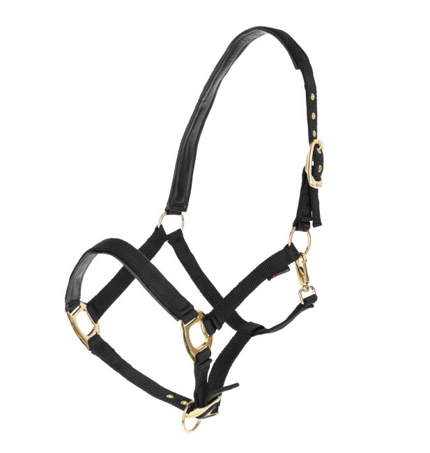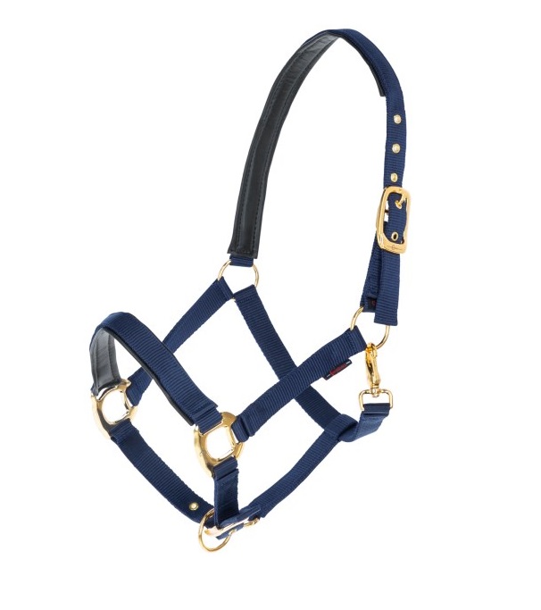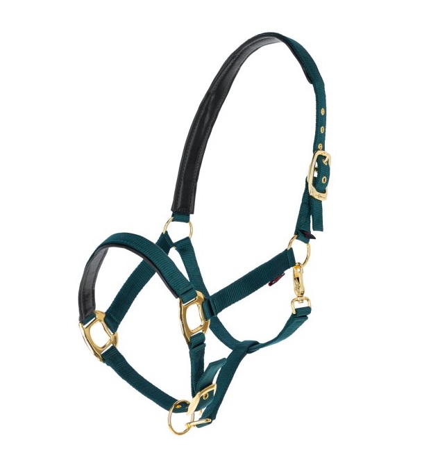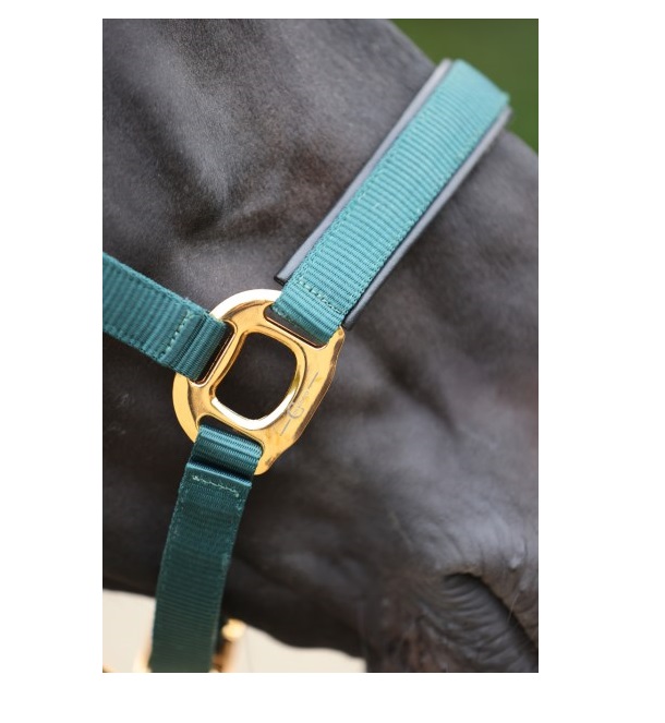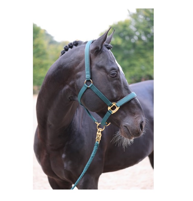 Недоуздок из высококачественной тесьмы, регулируемый на храпе и затылке. Карабин для удобства одевания. Подложка из очень мягкой искусственной кожи. Тройная прошитая тесьма на щеках и xрапе. Прочная и элегантная золотая фурнитура.