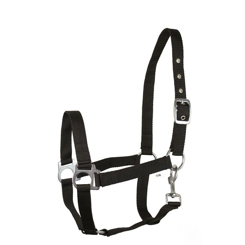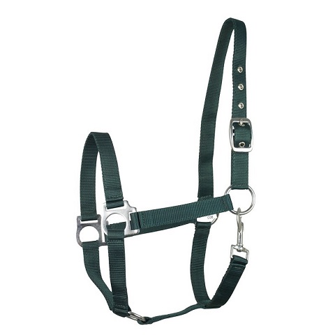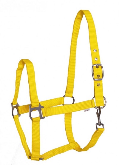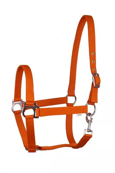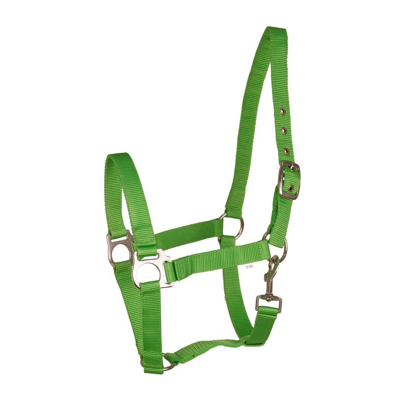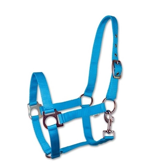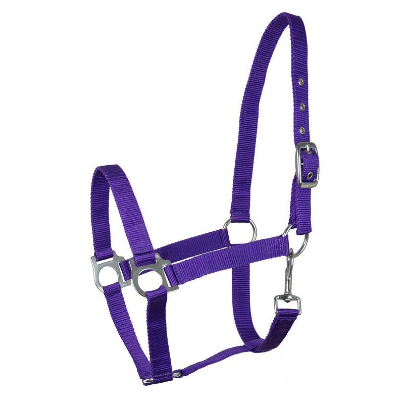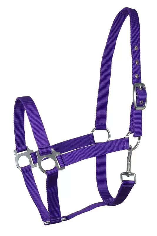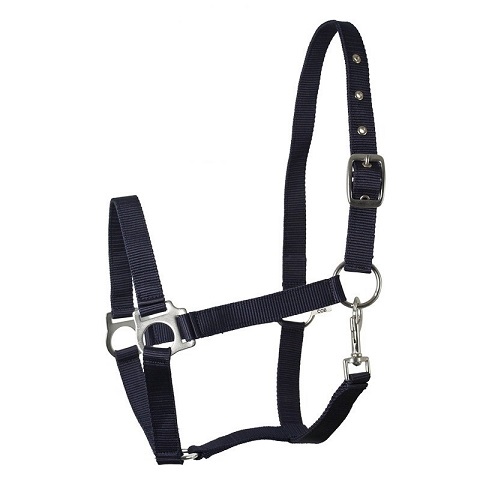 Недоуздок эконом-класса из прочной нейлоновой ленты с регулировкой на затылке и застежкой на карабине.