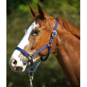Недоуздок эконом-класса из прочной нейлоновой ленты с регулировкой на затылке и храпе. Традиционные однотонные расцветки.