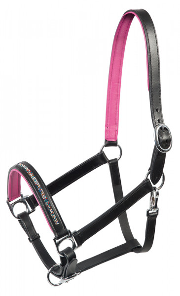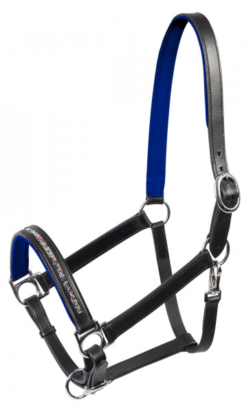 Крепкий недоуздок, сделанный из мягкой кожи, с регулировкой на храпе и затылке и карабином для удобства одевания. Недоуздок украшен контрасной подложкой и мозайкой из горного хрусталя на переносье.