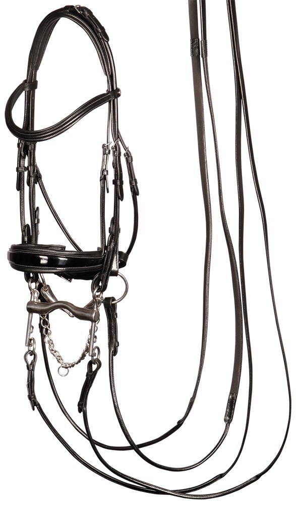 Мундштучное оголовье из высококачественной кожи, с широким самозатягивающимся (45 мм ) лакированным капсулем. Широкая мягкая подложка на храпе и затылке обеспечат дополнительный комфорт вашей лошади. Фурнитура из нержавеющей стали цвета белого металла. Ремни и поводья на крючках. В комплект входят два кожаных повода. У трензельного повода с внутренней стороны есть резиновая длинная нашивка против скольжения.
