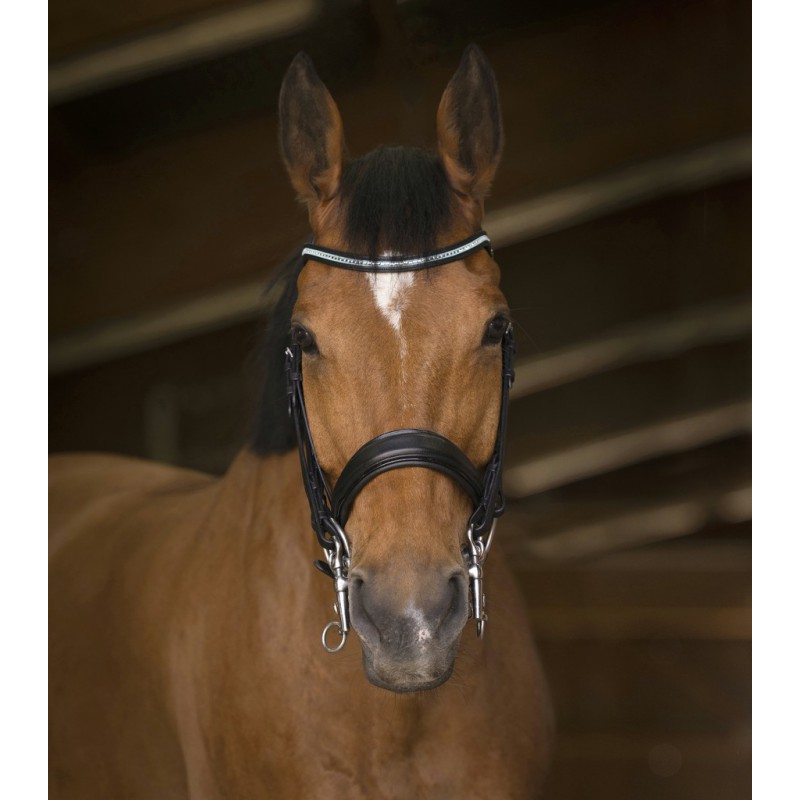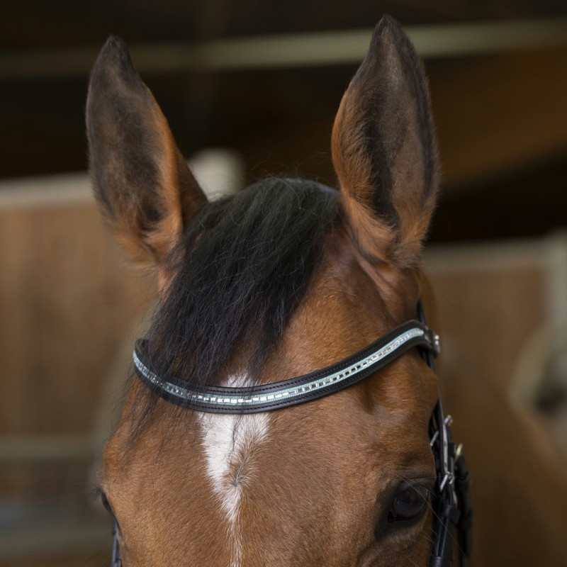 Оголовье выполнено из мягкой телячьей кожи премиум-качества. Анатомической формы широкий самозатягивающийся капсюль отлично дополняет оголовье. U-образным налобник с красивым цветным декором. Стальная фурнитура. Продается без поводьев