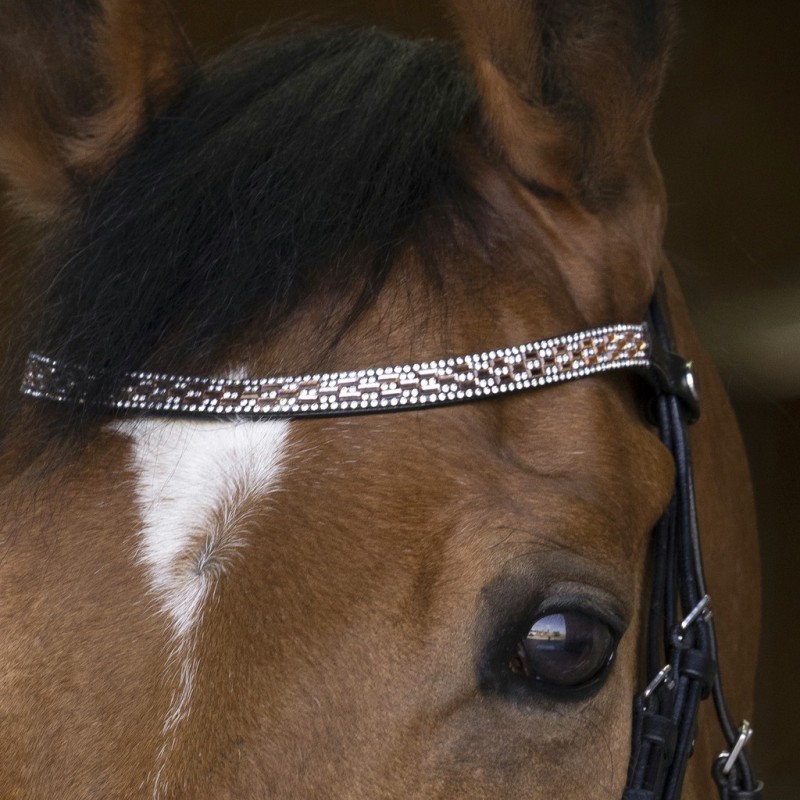 Оголовье выполнено из очень мягкой телячьей кожи премиум-качества. Анатомической формы широкий самозатягивающийся капсюль. Налобник украшен сверкающей мозайкой. Стальная фурнитура. Продается без поводьев