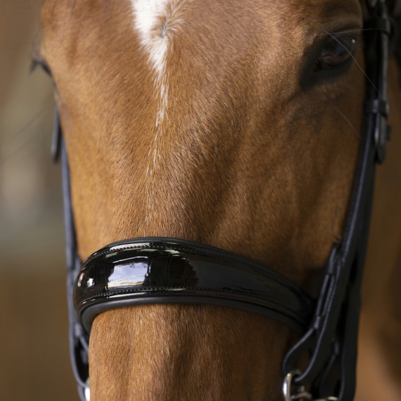 Утонченное оголовье из дутой кожи премиум-качества. Красивое мягкое лакированное покрытие, имитирующее кожу крокодила, украшает самозатягивающийся капсуль. Дутый V-образный налобник, дутые нащечные ремни и подбородный. Стальная фурнитура. Продается без поводьев