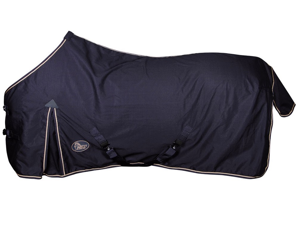 Очень прочная, тонкая и одновремеено плотная попона из смеси полиэстера с хлопком. Попона может использоваться как уличная или денниковая. Перекрестные попонодержатели под животом и двойные регулируемые застежки на груди. Специальные высокие выточки на плечах, позволяющие не сковывать движение лошади. Состав: полиэстер/хлопок. Машинная стирка при температуре 30 градусов.