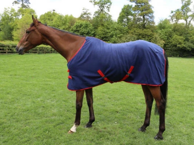 Сушильная попона из 100% нескатывающегося полиэстрового флиса плотностью 220 гр/м2. Перекрещивающиеся троки с пряжками и резиновыми ограничителями на животе. Отделка искусственной овчиной на холке. Петля для хвоста. Двойная застежка на груди. Машинная стирка при 30 градусах.