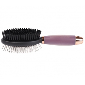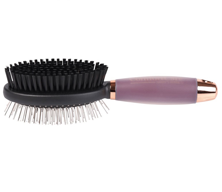 Удобная щетка для гривы и хвоста. С одной стороны на ней расположена плотная щетина, предназначенная для удаления мелкой грязи, а с другой стороны металлическая расческа, идеально разглаживающая конский волос. Адаптивная гелевая рукоять отлично ложится в руку.