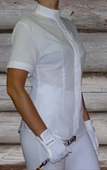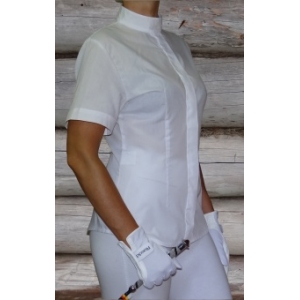 Белая, легкая турнирная рубашка с короткими рукавами. Покрой приталенный, воротник - стойка. Состав: 75% хлопок, 25% полиэстер. Деликатная стирка при 30С.