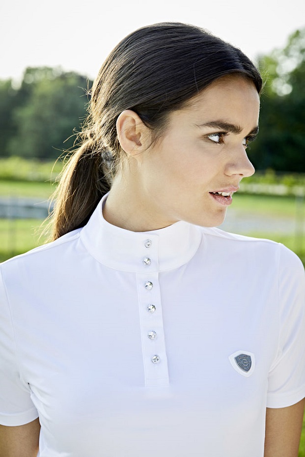 Стильная женская турнирная рубашка с коротким рукавом и воротником стоечка. Рубашка украшена сверкающими пуговицами и фирменной эмблемой на левой стороне груди. Рубашка станет отличным дополнением летнего гардероба на стартах или на повседневных тренировках. Изготовлена из мягкой высококачественной ткани. Прекрасно пропускает воздух и отводит влагу наружу. Состав: 95% полиэстер, 5% эластан . Европейские размеры. Деликатная стирка при 30 С.