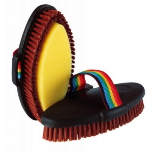 Двухцветная щётка на пластиковой основе с мягкой щетиной и поролоном. Мягкая щетина позволяет сделать шерсть лошади более блестящей, а благодаря поролону шампунь прекрасно пенится и экономно расходуется. Удобный ремешок для фиксации руки. Размер 15 х 5,5 см. Длина щетины 2,5 см