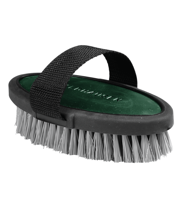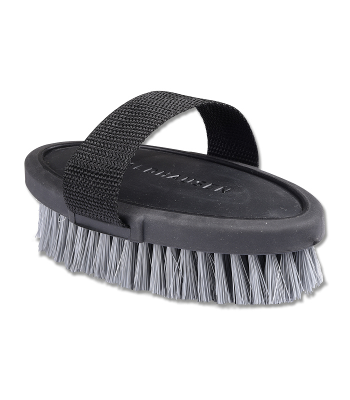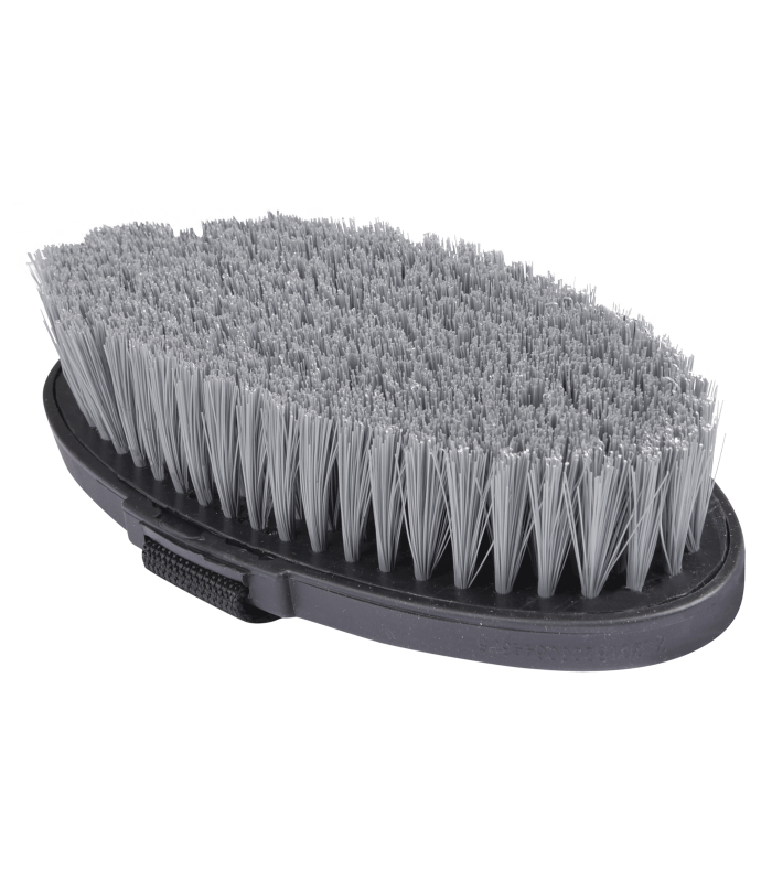 Щетка с густым искусственным ворсом средней жесткости на пластиковой основе и ремешком для руки. С тыльной стороны покрытие из высококачественной синтетической кожи. Щетки средней жесткости отлично подходят для ежедневного применения. Длина 18 см. Высота щетины 2,5 см.