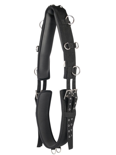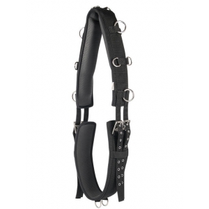 Мягкая седелка с гелевыми подушками для спины. Подкладка из гофрированного неопрена для лучшей вентиляции. Седелка имеет 12 колец, два из которых расположены снизу. Дырочки для регулировки, на длинных тесьмяных пристругах, укреплены металлическими блочками. Цвет черный. Размер: Cob (длина обхвата 137-204 см), Full (162-230 см).