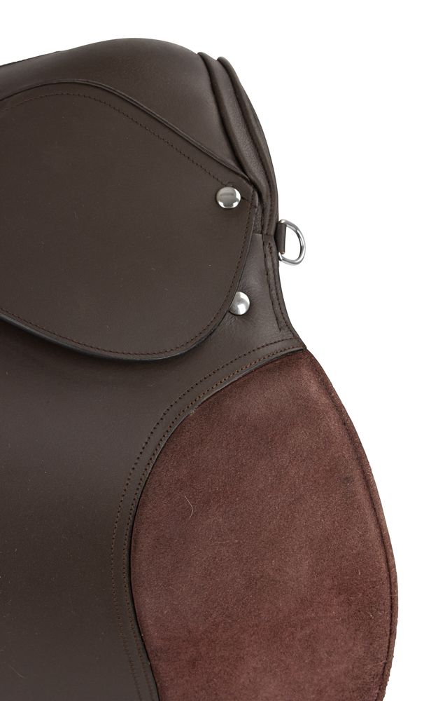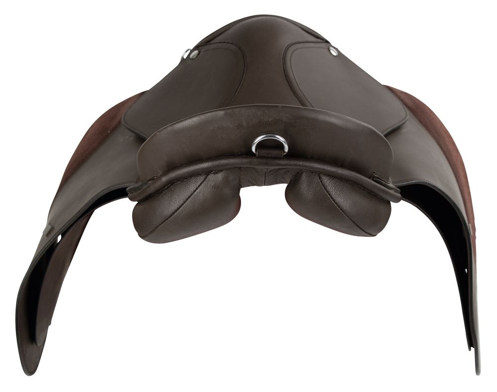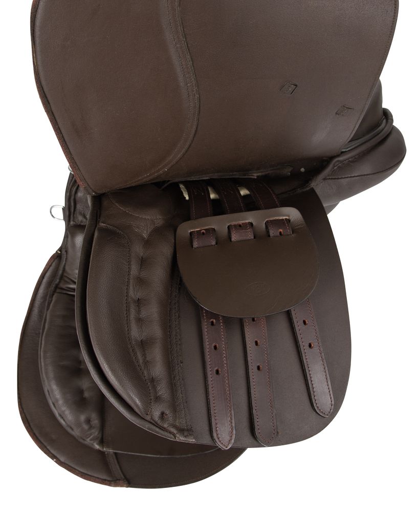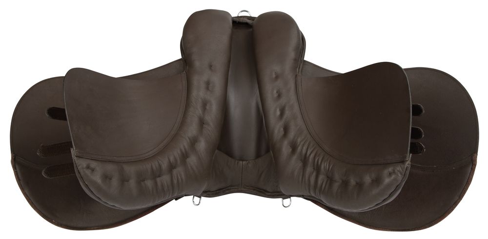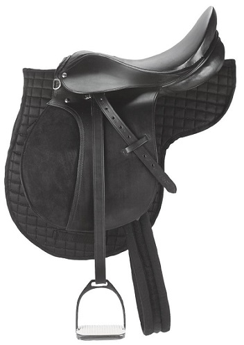Универсальное недорогое кожаное седло со сбором. Седло с ленчиком 30,5см подойдет на средне-узкую спину и невысокую холку Места коленых упоров покрыты нескользящей искусственной замшей. В комплект входят: вальтрап-трилистник, путлища, стремена, тесьмяная подпруга 125 см.