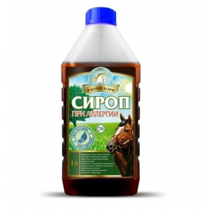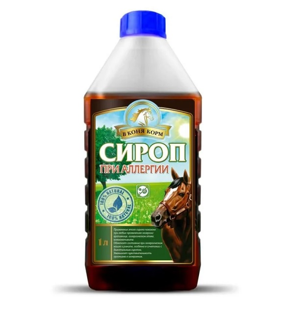 Производитель: "В коня корм", Россия Показания: применение этого сиропа показано при любых проявлениях аллергии: крапивнице, аллергическом отеке, конъюнктивите. Облегчает состояние при аллергическом кашле и рините, особенно в сочетании с дыхательным сиропом. Уменьшает чувствительность организма к аллергенам. Противопоказания: индивидуальная непереносимость компонентов. Состав: экстракты череды, фиалки трехцветной, крапивы, ромашки, хмеля, кошачьего когтя, липового цвета, лимонная кислота, сахарная сиропная основа. Способ применения и дозы: сироп дают перорально взрослым лошадям по 50-70 мл, жеребятам и пони по 20-30 мл (в зависимости от массы животного), 2-3 раза в день. Курс лечения составляет 7-14 дней, в зависимости от состояния лошади и длительности воздействия аллергенов.