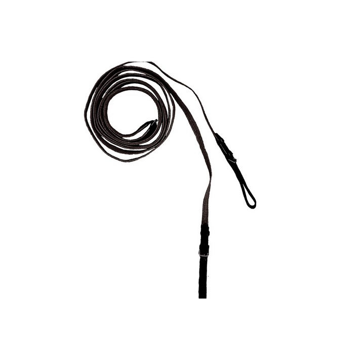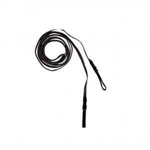 Скользящий повод из длинной тесьмы и двух кожаных петель на пряжках. Скользящий повод - это вспомогательный повод, идущий от подпруги (снизу или по бокам) через трензельные кольца в руки всадника. Не даёт лошади высоко поднимать голову и помогает наладить контакт с лошадью в некоторых ситуациях. Цвет: черный. Длина 5,5 метра. Ширина повода: 17 мм