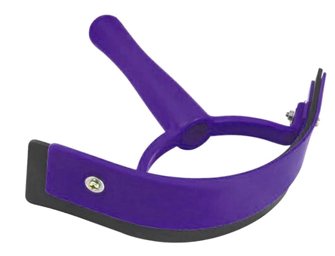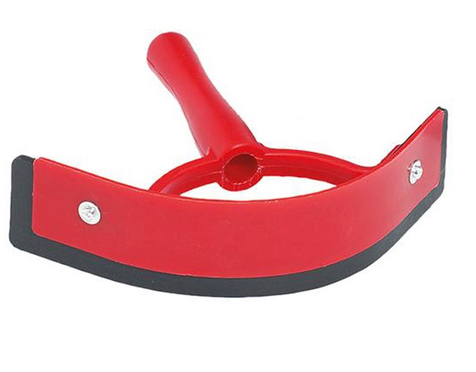 Прочный пластиковый скребок для удаления воды и пота с шерсти лошади. Скребок оснащен удобной ручкой и резиновой водосборной поверхностью.