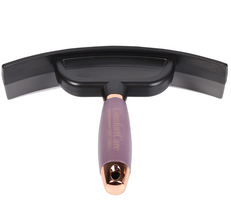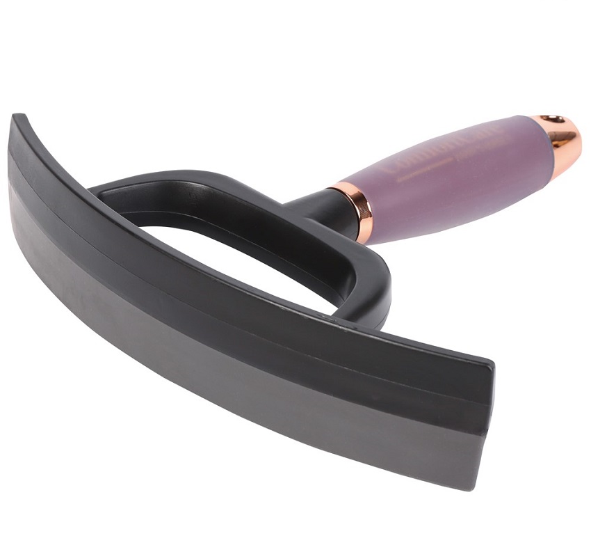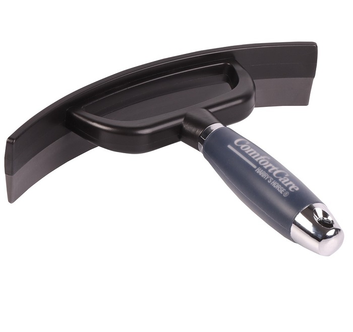 Прочный пластиковый скребок для удаления воды и пота с шерсти лошади. Скребок оснащен адаптивной гелевой ручкой и резиновой водосборной поверхностью.