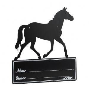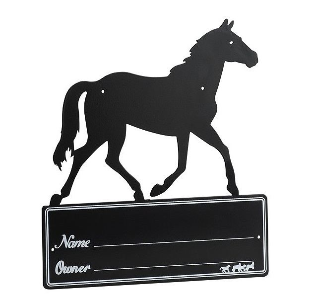 Металлическая табличка с силуэтом лошади, на которой можно написать имя и дату рождения лошади, а также имя хозяина. Табличка имеет отверстия для крепления и крепится при помощи саморезов. Размер: 25 x 21см.