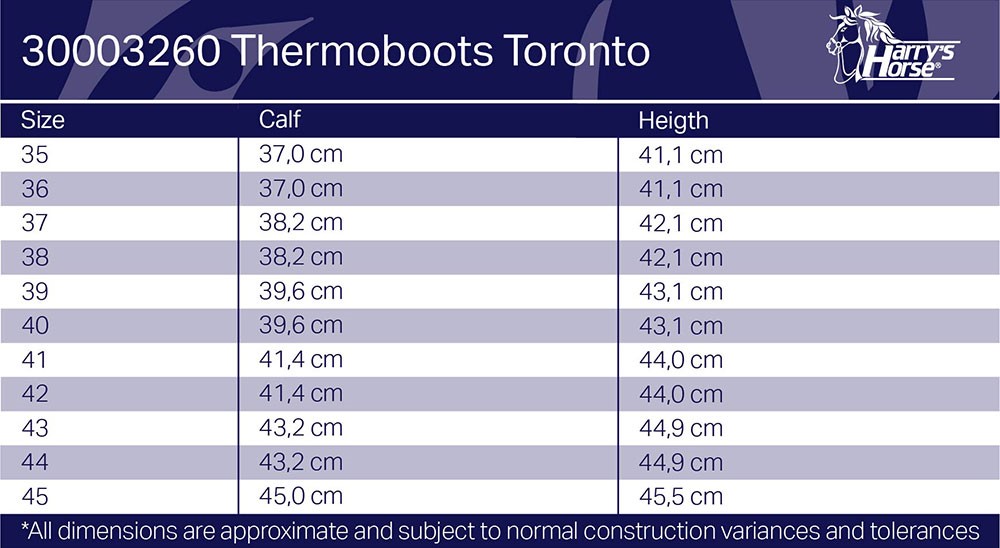 Термосапоги Harrys Horse Toronto идеальный выбор для всадников, которые хотят ездить круглый год, независимо от погоды. Эти термосапоги сочетают в себе тепло, комфорт и функциональность. Важнейшие особенности: 1. Теплые термосапоги на молнии 2. Светоотражающая окантовка снаружи для дополнительной видимости 3. Верх из шероховатого неопрена для мягкости 4. Подкладка над лодыжкой для дополнительного тепла и комфорта 5. Водонепроницаемая резиновая основа.