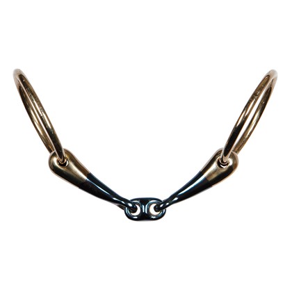 Не широкий трензель-восьмерка с маленьким средним звеном сделан из стали Sweet Iron (сладкое железо). Sweet Iron-это металл, который после нагревания принимает красивый синий цвет. Sweet Iron развивает поверхностную ржавчину при контакте с влагой воздуха и слюной лошади. Сладкий вкус этой поверхностной ржавчины естественным образом стимулирует выработку слюны, что делает трензель более приемлимым для лошади. Подвижные кольца сделаны из высококачественной нержавеющей стали. Изогнутая форма трензеля приятна для лошади. Железо со временем будет менять свой цвет и покрываться небольшим поверхностным слоем ржавчины. Диаметр колец 65 мм, толщина грызла 14 мм.