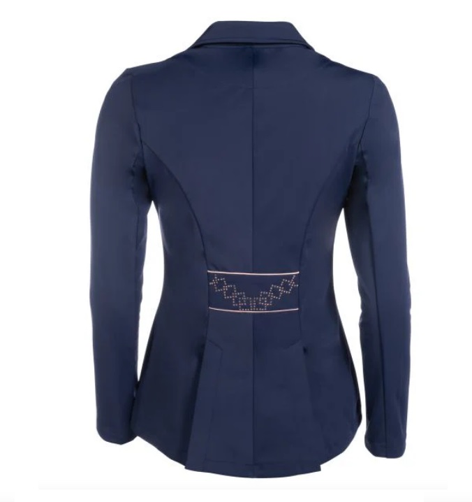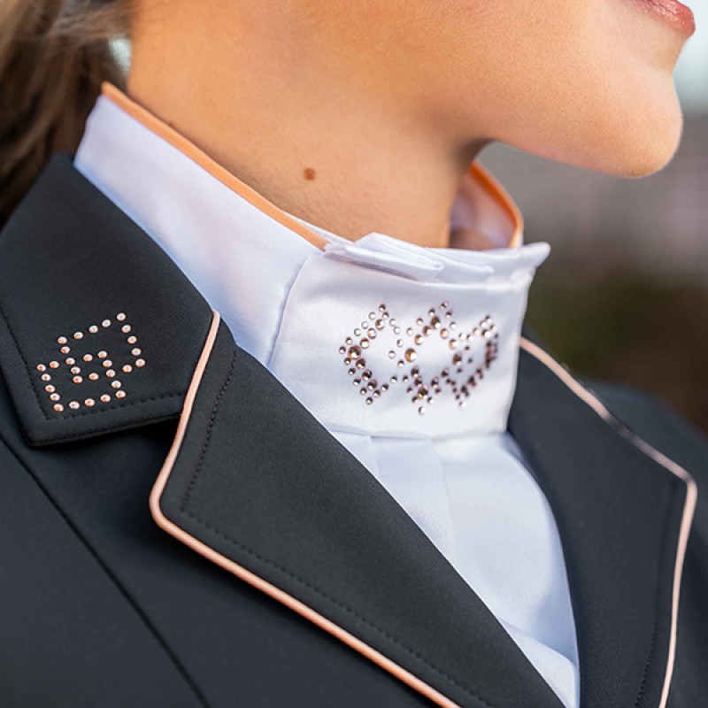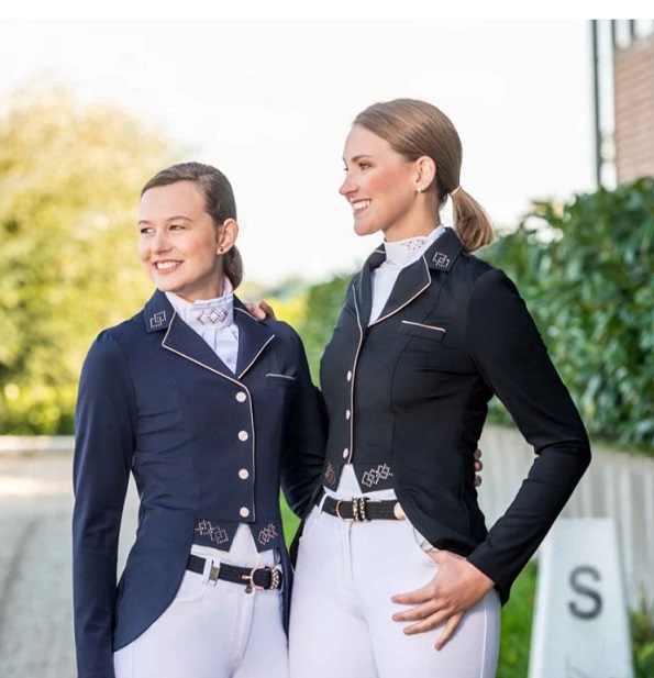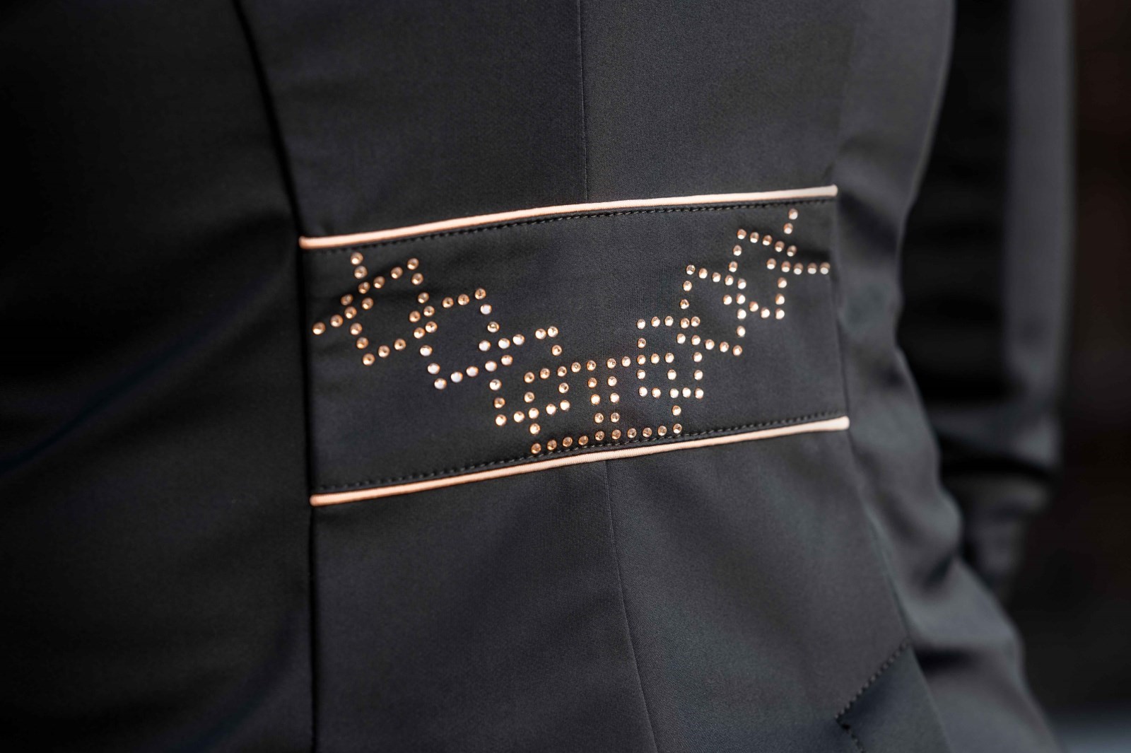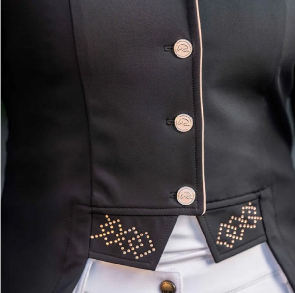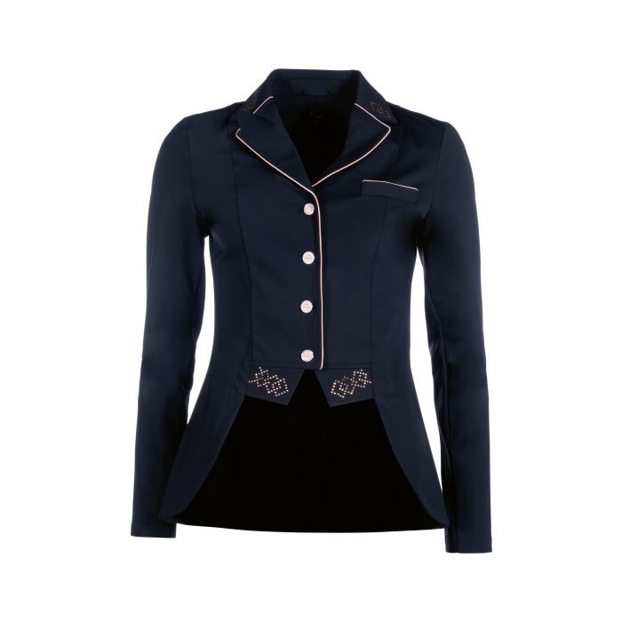 Элегантный укороченный фрак для выездки. Ткань отталкивает влагу и грязь, легко чистится и стирается. Приталенный крой, широкие лацканы, маленький нагрудный кармашек. Контрастная окантовка и украшение из страз для изысканного дизайна.