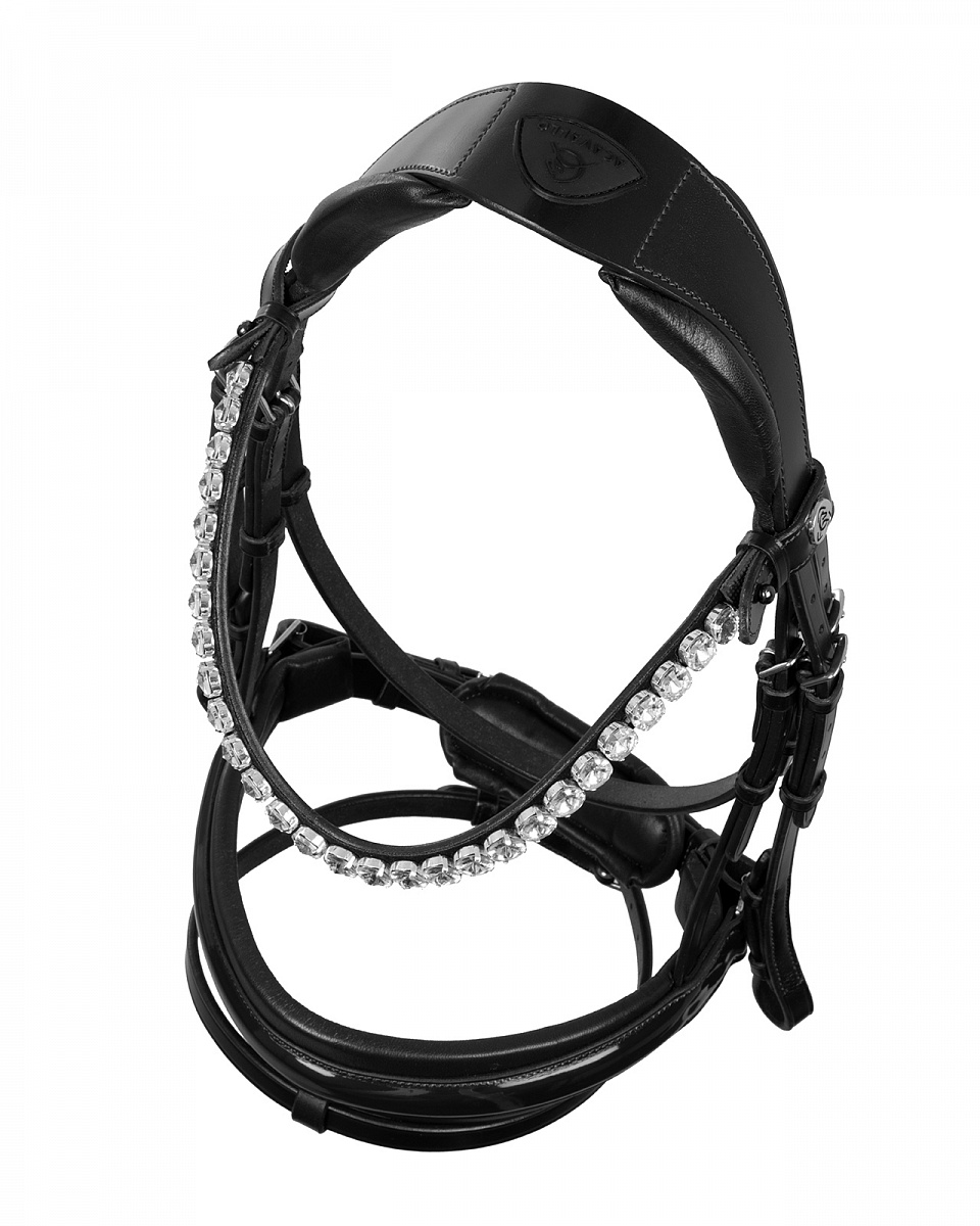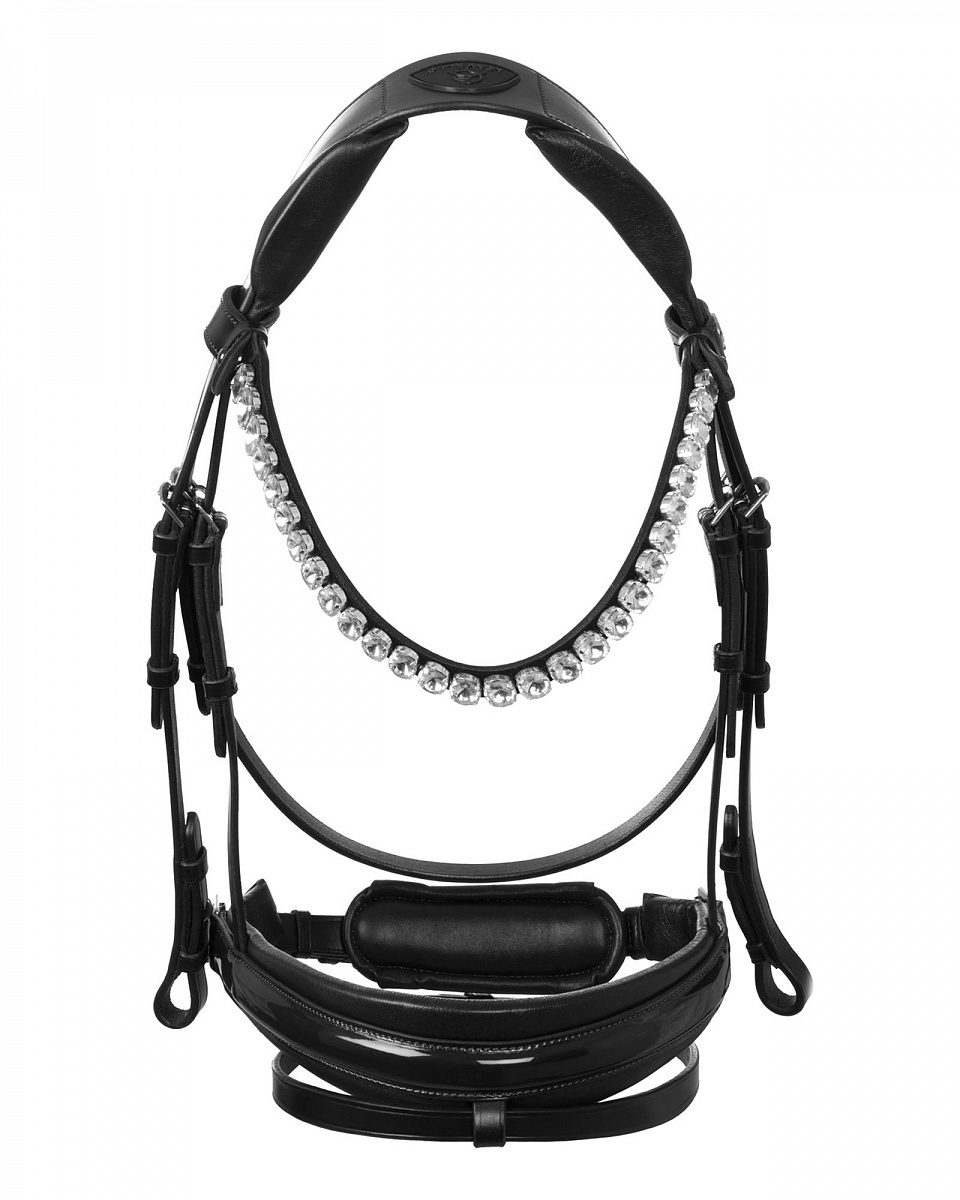 Роскошная уздечка "OPHELIA" от Acavallo. Нежная телячья кожа с мягкой латексной подложкой. Сверхмягкий анатомический затылочный ремень, широкий, самозатягивающийся капсуль с лаковым покрытием, съемный ремешок-восьмерка. Великолепный налобный ремень с крупными кристаллами, хромированная серебристая фурнитура и фирменная маркировка на затылочном ремне. Повод в комплект не входит.