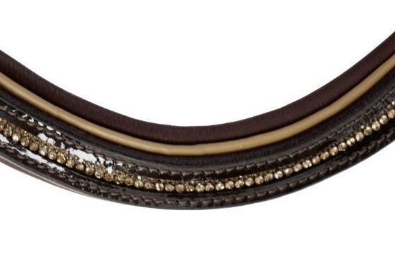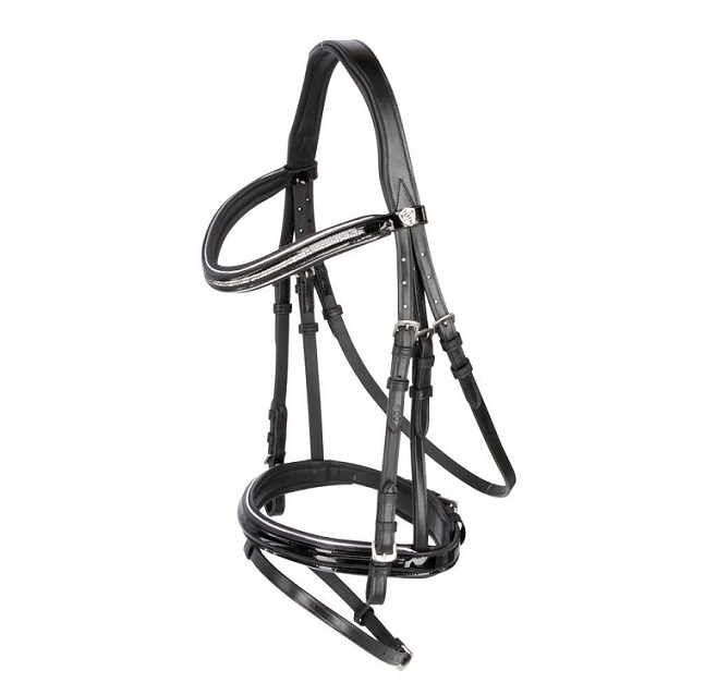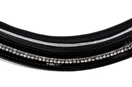Притягивающее взгляды лакированное оголовье из мягкой кожи. U-образный налобник декорирован контрастным кантом и украшен мелкими стразиками. Мягкая подложка на капсуле и затылке обеспечат максимальный комфорт для вашей лошади. В комплект входит тесьмяный повод с нашивками против скольжения. Материалы: 100% кожа, пряжки из нержавеющей стали.