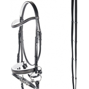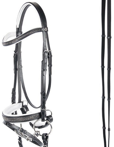 Роскошная, мягкая, кожаная уздечка с широким ( 3,5 см) супер мягким капсулем обеспечит вашей лошади максимум комфорта. U-образный анатомический налобник и капсуль украшены металлической имитацией под мелкие стразики. В комплект входит тесьмяный повод с нашивками против скольжения. Материалы: 100% высококачественная кожа, пряжки из нержавеющей стали. Цвет кожи: черный, подложка белый