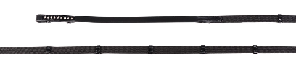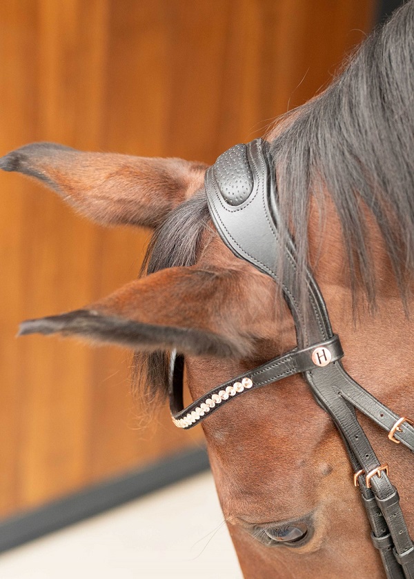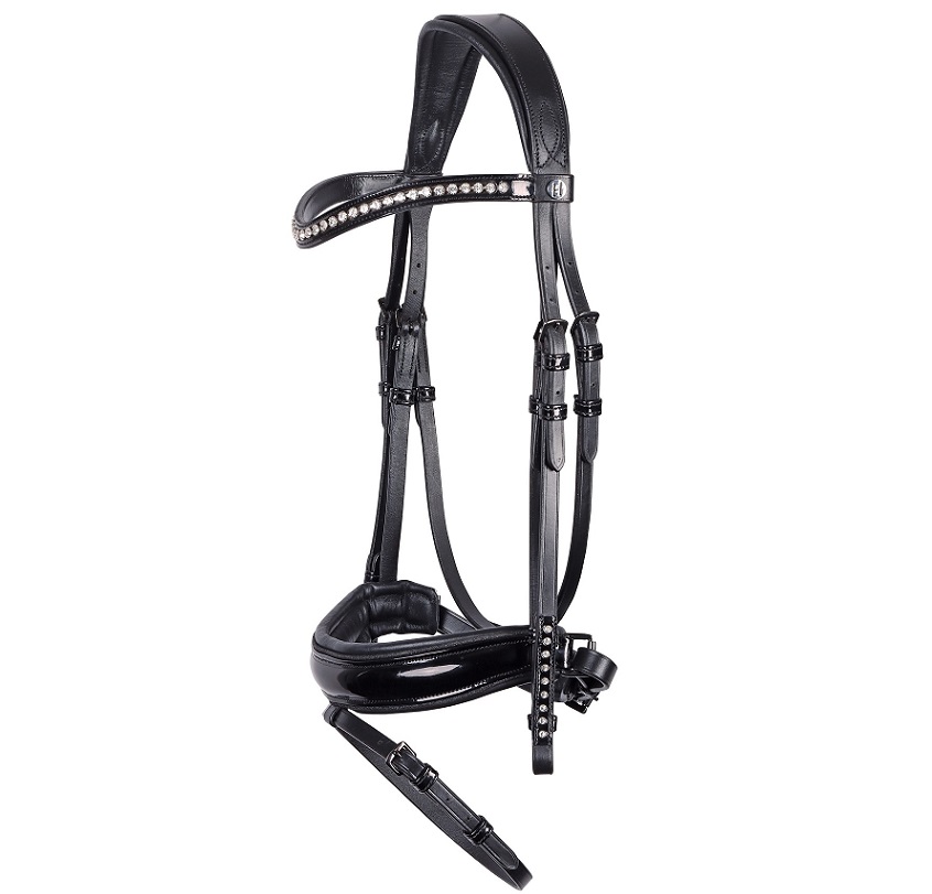 Роскошное оголовье из высококачественной кожи с самозатягивающимся капсюлем. Затылочный ремень анатомической формы и широкий капсюль на мягкой подложке, что обеспечивает максимальный комфорт вашей лошади. Налобный ремень и капсюль выполнены из лаковой кожи. Налобный, трензельный ремень и повод украшены ослепительными стразами. В комплект входит тесьмяный повод с нашивками.