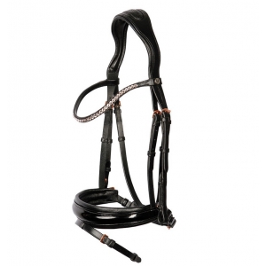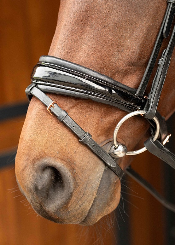Премиум-уздечка из качественной кожи с очень мягкой подкладкой под затылочным ремнем и капсюлем. Лакированная носовая часть имеет анатомическую форму. Уздечка украшена фурнитурой и ослепительными кристаллами на налобнике цвета «розовое золото». Очень удобный затылочный ремень со свободной зоной в области ушей. В комплект входит тесьмяный повод с нашивками против скольжения.