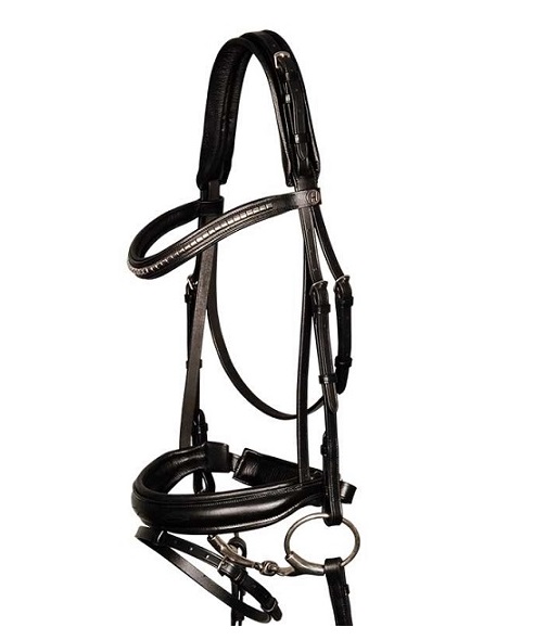 Кожаная уздечка с широким самозатягивающимся, анатомическим ( 3,6 см) капсулем и анатомическим затылочным ремнем с мягкой подложкой, обеспечит вашей лошади максимум комфорта. U-образный налобник, украшеный металлическими вставками. В комплект входит тесьмяный повод с нашивками против скольжения.