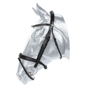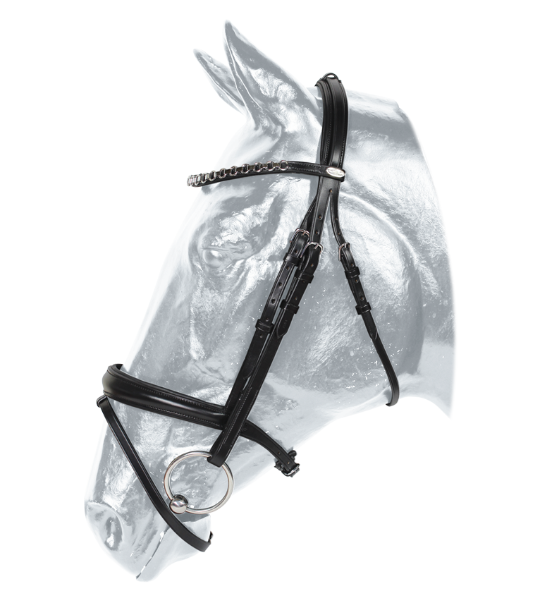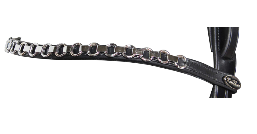 Классическая уздечка с английским съемным капсулем из итальянской кожи высшего качества. Налобный ремень украшен оригинальной серебристой металлической цепочкой. Хромированная фурнитура серебристого цвета на пряжках. Носовой, налобный и затылочный ремни с мягкой подкладкой. В комплект входит тесьмяный повод.