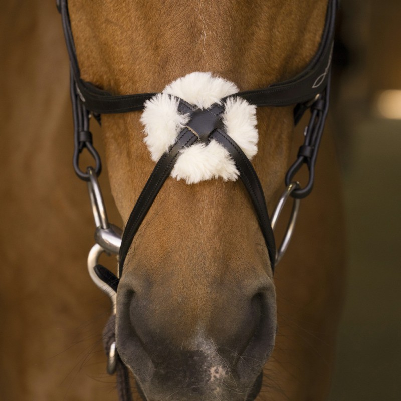 Кожаная уздечка с мексиканским капсулем, украшенная декоративной отстрочкой, которая придает утонченный, элегантный вид. Мягкая подложка и искусственный мех на переносье. Продается без повода