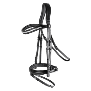Роскошная уздечка X-Line Supersoft Joy от Waldhausen из очень мягкой кожи. Самозатягивающийся анатомический капсуль. Изогнутый налобный ремень с украшением из страз. Капсюль, налобник и затылочный ремень на мягкой подкладке. В комплект входит тесьмяный повод.