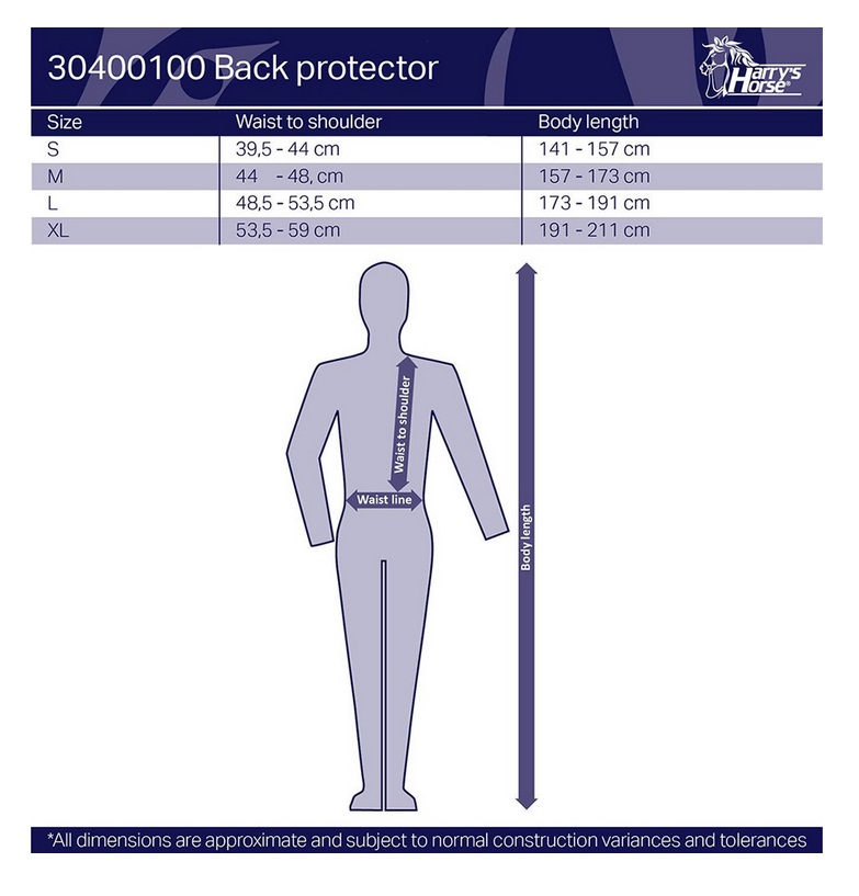 Защитный жилет Back protector (задняя защита) последнего поколения. Back protector специально разработан для оптимальной гибкости и свободы движения всадника. Благодаря использованию эластичных материалов, задняя защита оптимально облегает тело и может носиться под верхней одеждой. Область спины усилена слоями полиуритановой пены для лучшей воздухопроницаемости и легкости при движении. :Жилет одевается как простая жилетка и застегивается при помощи передней молнии. Этот жилет был протестирован и одобрен Европейским стандартом качества BS EN1621-2:2014. Размер S на рост 141-157 см. Размер M на рост 157-173 см. Размер L на рост 173-191 см Размер XL на рост 191-211 см.