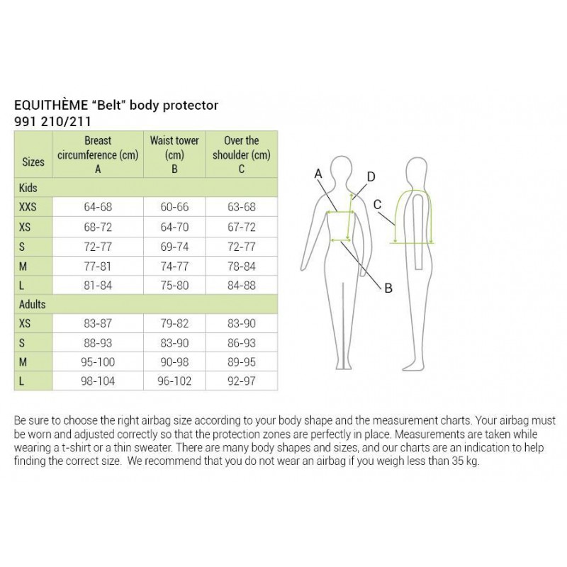 Защитный жилет с набивкой из пеноматериала высокой плотности, очень мягкий и легкий. Застежка-молния спереди, регулировка по бокам и плечам с помощью липучек. Полностью закрытые боковые стороны, поддерживающий ремень регулируется внутри с помощью клипсы. Съемный чехол, можно стирать вручную. Соответствует европейскому стандарту EN13158: 2009 уровень 3. Подбор размера защитного жилета: Защитный жилет должен правильно прилегать к телу и его должно удобно носить в различных положениях тела при езде на лошади. Задняя часть жилета не должна касаться седла во время езды. Защитные жилеты разработаны так, чтобы одевать их на легкую одежду, они должны плотно прилегать и не двигаться во время езды. Если ваш жилет подогнан правильно, он должен закрывать ваш торс. Передняя часть должна выходить ниже последнего ребра по крайней мере на 25 мм, не сгибаясь в сторону тела всадника, если на нее надавить. Верхняя часть задней стороны должна доходить до выступающих костей у основания шеи (седьмой шейный позвонок).